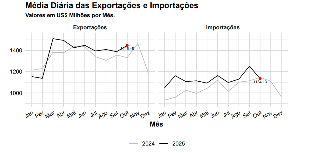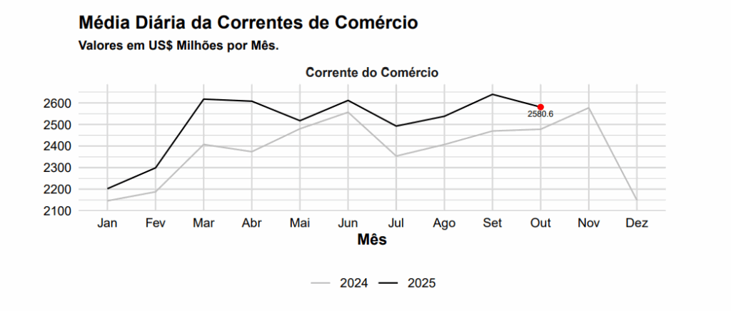 Outubro 2024: US$ 1.145,89 milhões por dia Outubro 2025: US$ 1.134,13 milhões por dia Variação: -1,0%