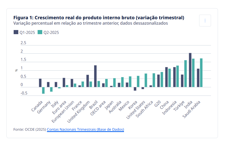 Quando comparamos com o mesmo período do ano anterior, o cenário fica ainda mais interessante. O PIB da área do G20 foi 3,5% maior no segundo trimestre de 2025 em relação ao segundo trimestre de 2024, uma aceleração em relação aos 3,3% do trimestre anterior. Esse crescimento anual mais robusto indica uma tendência de recuperação sustentada.